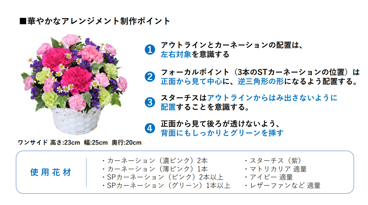 商品を作る前に、講習会サイトで花材・資材表を確認してください。サイズ、使用花材、使用資材、価格、QRコードが記載されています。QRコードをスマートフォンやタブレット端末で読み取ると、商品制作動画を見ることができます。